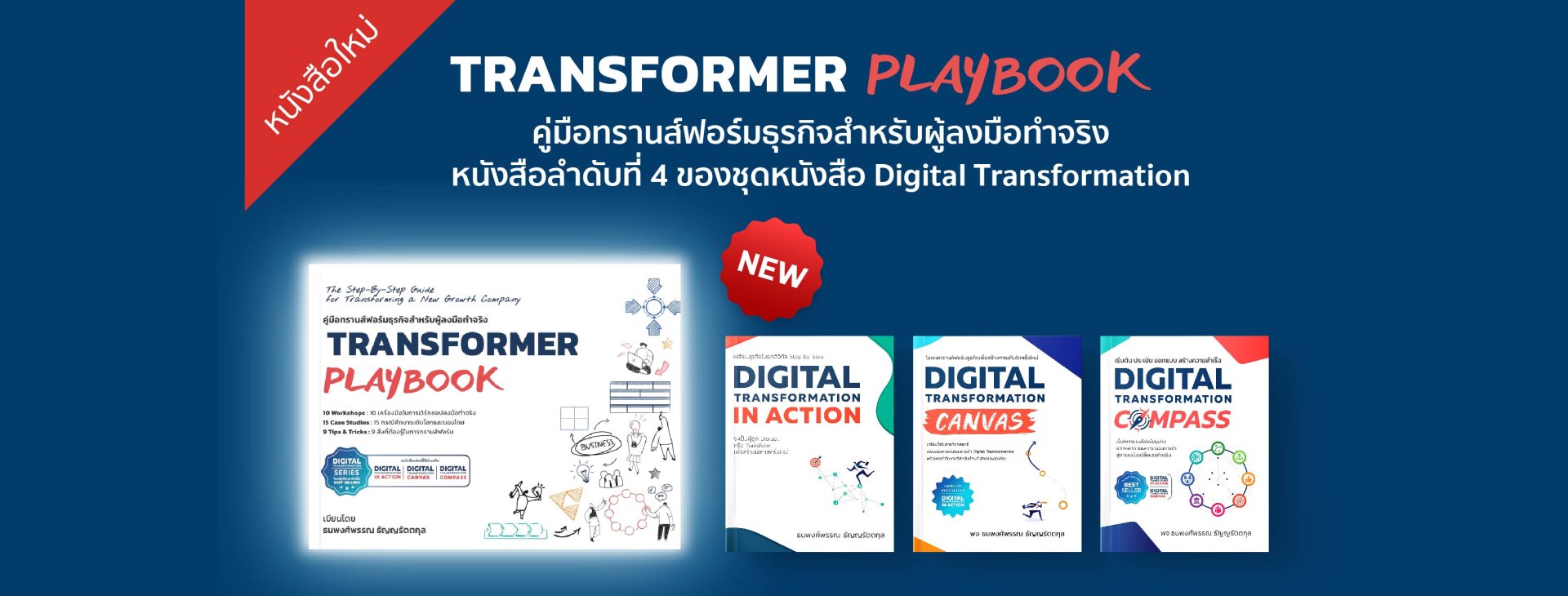 ดังนั้น TRANSFORMER PLAYBOOK จะเป็นหนังสือที่เป็นเครื่องมือ เป็นคู่มือ เป็นผู้ช่วยของทุกท่าน ที่เป็นทั้งผู้บริหาร เป็นเจ้าของกิจการ เป็นผู้ประกอบการ ตั้งแต่ระดับ เล็ก กลาง ใหญ่ ใหญ่มาก จนไปถึง Startup แม้แต่องค์กรไม่แสวงหากำไร หรือองค์ภาครัฐ นำแนวคิดของหลักการ TRANSFORMER PLAYBOOK ทั้งหมดจะมี 10 Workshop ตั้งแต่ Step ที่ 1 – 10 แต่ละ Workshop จะมีกรณีศึกษาตัวอย่าง 15 กรณีศึกษาระดับโลกและของไทย และ 9 Tips & Tricks สิ่งที่ต้องรู้ทันการทรานส์ฟอร์ม ทั้งหมดนี้อยู่ในแบบรูปเล่ม และแถมไปในลิงค์ที่อยู่ในหนังสือทั้ง 10 Workshop ที่ทุกท่านสามารถดาวน์โหลดและนำไปปรับใช้ในองค์กรของทุกท่านได้ รวมถึงในรูปแบบ E-Book ที่เป็นบทความเพิ่มเติมทั้งหมดเกือบ 400 หน้า ในราคา 300 บาท ผมหวังว่าหนังสือ TRANSFORMER PLAYBOOK ซึ่งเป็นหนังสือเล่มที่ 4 ของหนังสือชุด Digital Transformation นี้ น่าจะมีส่วนช่วยให้กับทุกท่าน นักอ่านทุกท่าน ไม่มากก็น้อยที่เราจะต้องก้าวสู่การเป็นองค์กรดิจิทัลอย่างแท้จริงไปด้วยกันในเศรษฐกิจดิจิทัล