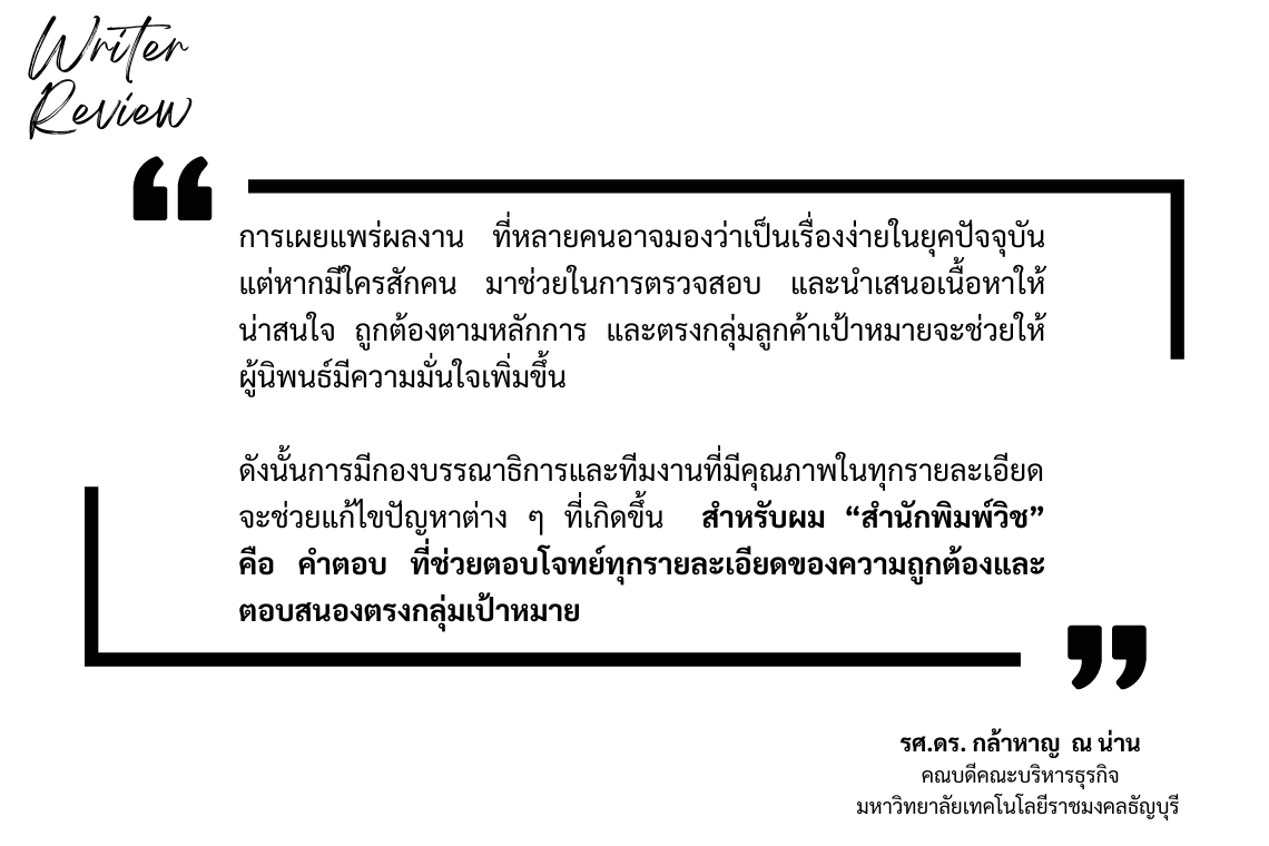 สำนักพิมพ์วิช มีประสบการณ์ในการจัดทำ หนังสือตำราวิชาการ งานวิจัย และหนังสือประกอบการยื่นขอตำแหน่งทางวิชาการ ดูแลผลงานด้วยทีมงานมืออาชีพที่คร่ำหวอดในวงการสิ่งพิมพ์มานานกว่า 30 ปี ให้บริการครบจบในที่เดียว ทั้งการจัดการต้นฉบับ ออกแบบ จัดพิมพ์ และ จัดจำหน่ายพร้อมเผยแพร่ประชาสัมพันธ์
